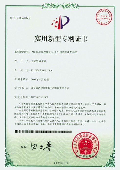 闊達(dá)4F單管單線擁有中華人民共和國知識產(chǎn)權(quán)局頒發(fā)的發(fā)明專利證書。