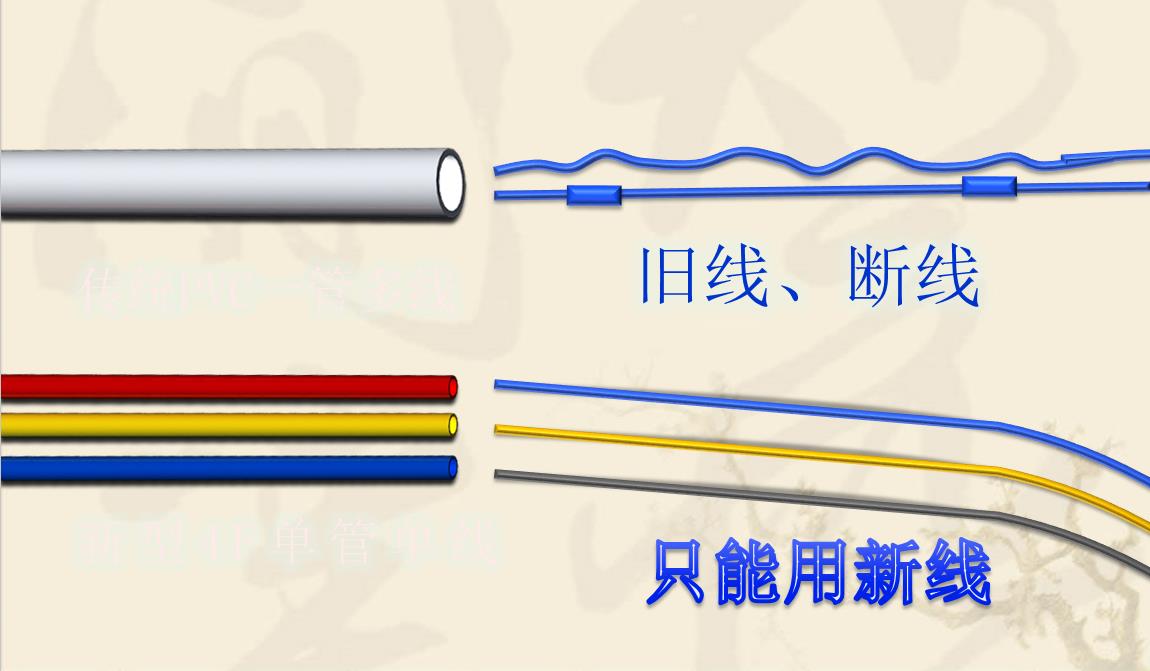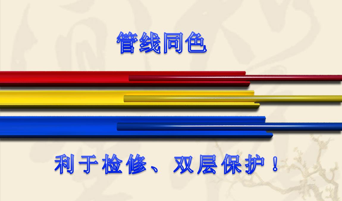 3. 線/管各分為四種顏色,對應(yīng)相應(yīng)電線,清楚區(qū)別火線、零線、地線、回路線,非專業(yè)人員也能識別并維修更換,實實在在保證施工與維修中不會發(fā)生接錯的現(xiàn)象,保證用電安全。